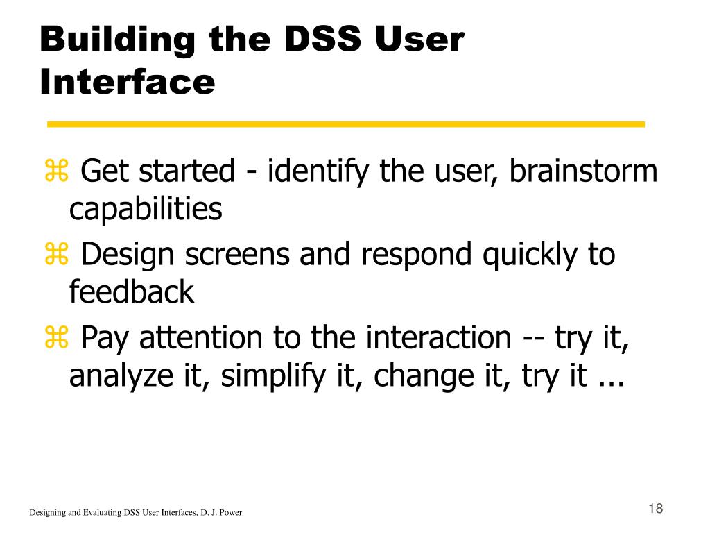 Building the DSS User Interface • Get started - identify the user, brainstorm capabilities • Design screens and respond quickly to feedback • Pay attention to the interaction -- try it, analyze it, simplify it, change it, try it ... Designing and Evaluating DSS User Interfaces, D. J. Power