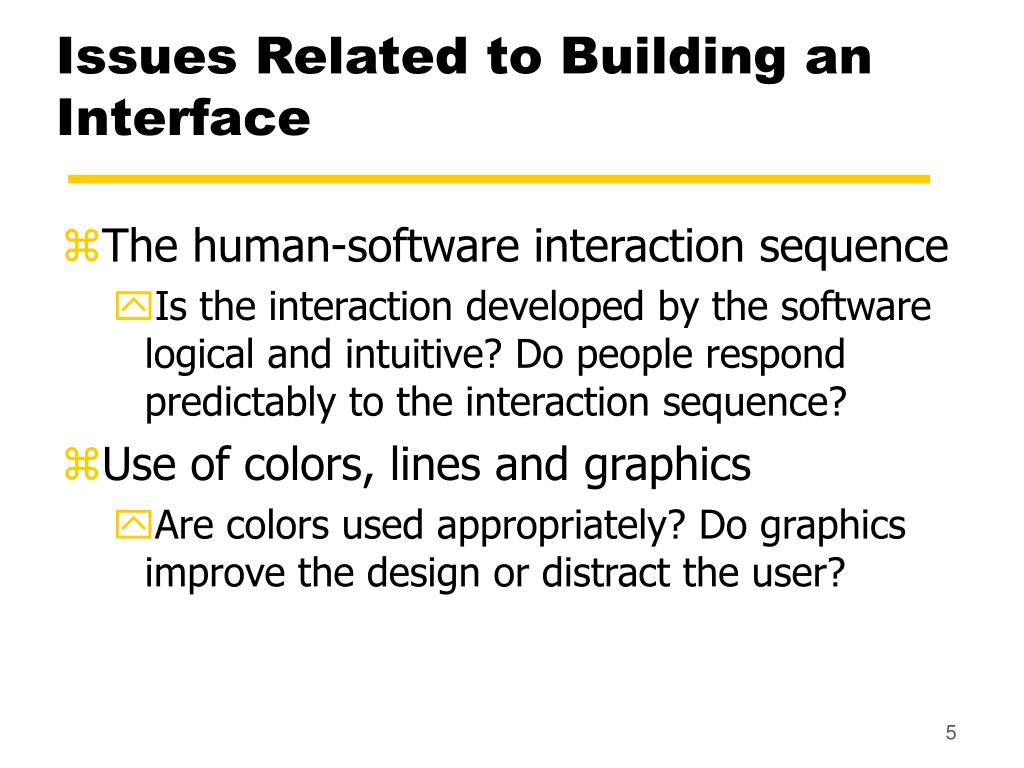 Issues Related to Building an Interface • The human-software interaction sequence • Is the interaction developed by the software logical and intuitive? Do people respond predictably to the interaction sequence? • Use of colors, lines and graphics • Are colors used appropriately? Do graphics improve the design or distract the user?