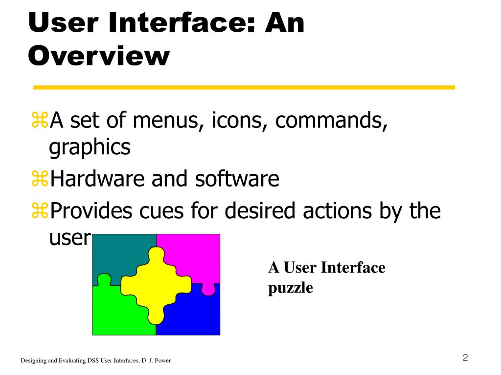 User Interface: An Overview • A set of menus, icons, commands, graphics • Hardware and software • Provides cues for desired actions by the user A User Interface puzzle Designing and Evaluating DSS User Interfaces, D. J. Power