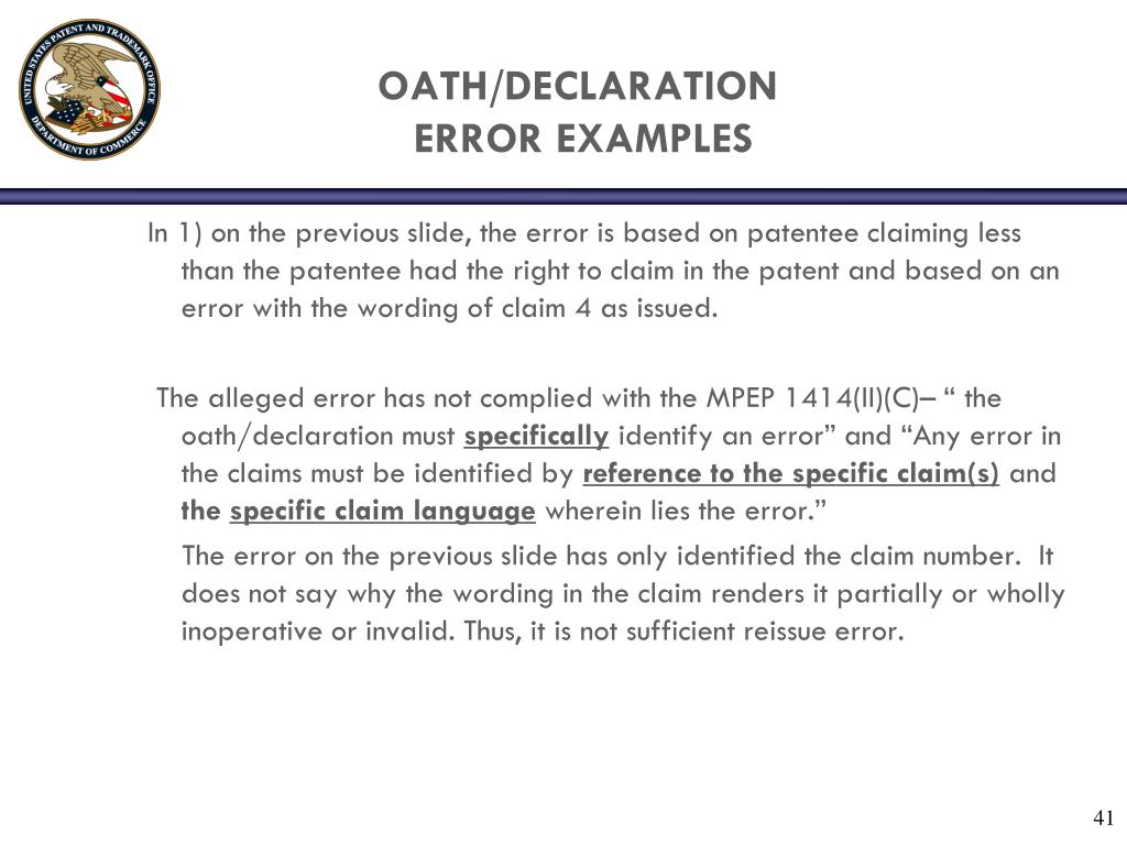 OATH/DECLARATION ERROR EXAMPLES • In 1) on the previous slide, the error is based on patentee claiming less than the patentee had the right to claim in the patent and based on an error with the wording of claim 4 as issued. • The alleged error has not complied with the MPEP 1414(II)(C)– “ the oath/declaration must specificallyidentify an error” and “Any error in the claims must be identified by reference to the specific claim(s) and the specific claim language wherein lies the error.” • The error on the previous slide has only identified the claim number. It does not say why the wording in the claim renders it partially or wholly inoperative or invalid. Thus, it is not sufficient reissue error.