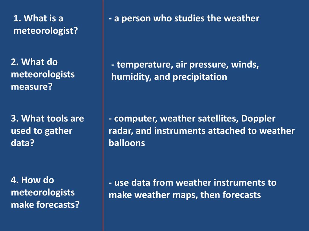 1. What is a meteorologist? - a person who studies the weather 2. What do meteorologists measure? - temperature, air pressure, winds, humidity, and precipitation 3. What tools are used to gather data? - computer, weather satellites, Doppler radar, and instruments attached to weather balloons 4. How do meteorologists make forecasts? - use data from weather instruments to make weather maps, then forecasts
