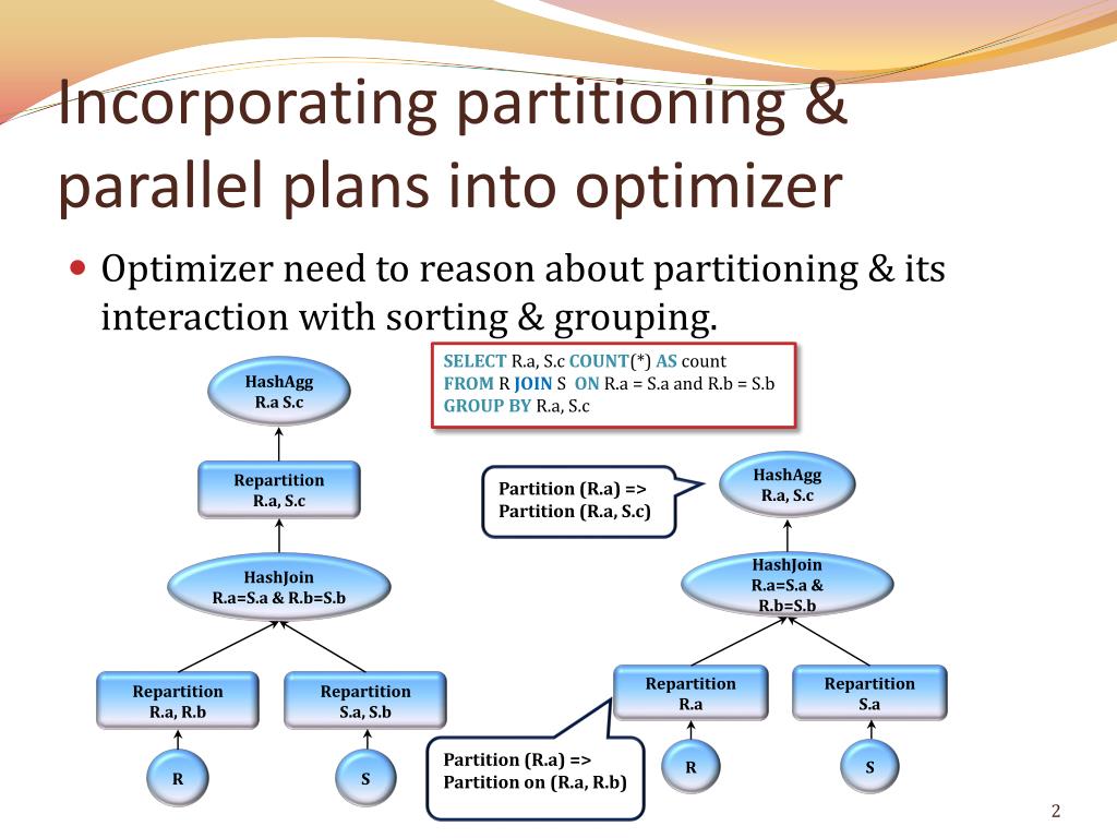 Incorporating partitioning & parallel plans into optimizer • Optimizer need to reason about partitioning & its interaction with sorting & grouping. SELECTR.a, S.cCOUNT(*) AS countFROMRJOINSONR.a = S.a and R.b = S.bGROUP BYR.a, S.c HashAgg R.aS.c Partition (R.a) => Partition (R.a, S.c) HashAgg R.a, S.c Repartition R.a, S.c HashJoin R.a=S.a & R.b=S.b HashJoin R.a=S.a & R.b=S.b Repartition R.a, R.b Repartition S.a, S.b Repartition R.a Repartition S.a Partition (R.a) => Partition on (R.a, R.b) R S R S