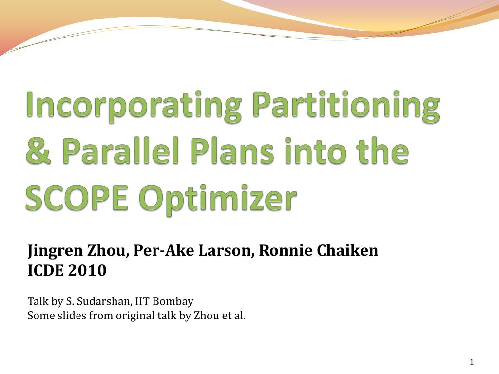 Incorporating Partitioning & Parallel Plans into the SCOPE Optimizer. Jingren Zhou, Per- Ake Larson, Ronnie Chaiken ICDE 2010 Talk by S. Sudarshan, IIT Bombay Some slides from original talk by Zhou et al. Incorporating partitioning & parallel plans into optimizer.
