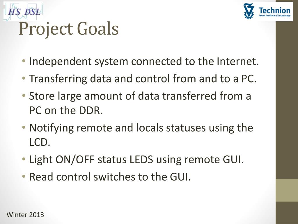 Project Goals • Independent system connected to the Internet. • Transferring data and control from and to a PC. • Store large amount of data transferred from a PC on the DDR. • Notifying remote and locals statuses using the LCD. • Light ON/OFF status LEDS using remote GUI. • Read control switches to the GUI.