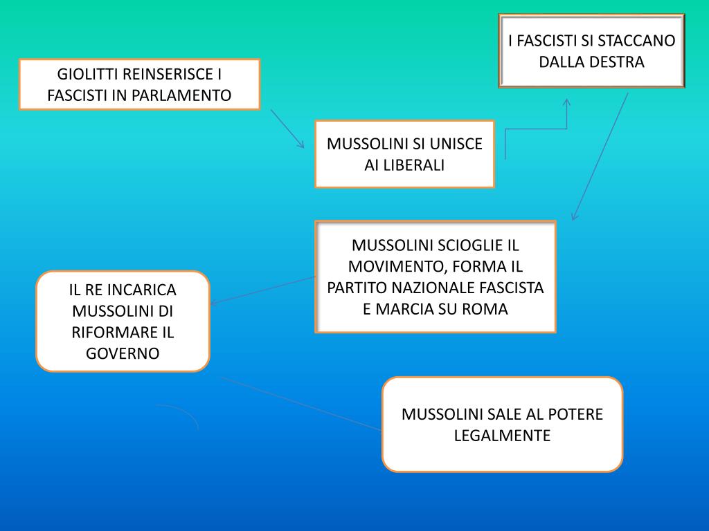 I FASCISTI SI STACCANO DALLA DESTRA GIOLITTI REINSERISCE I FASCISTI IN PARLAMENTO MUSSOLINI SI UNISCE AI LIBERALI MUSSOLINI SCIOGLIE IL MOVIMENTO, FORMA IL PARTITO NAZIONALE FASCISTA E MARCIA SU ROMA IL RE INCARICA MUSSOLINI DI RIFORMARE IL GOVERNO MUSSOLINI SALE AL POTERE LEGALMENTE