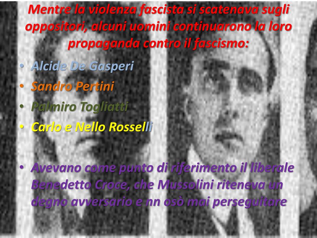 Mentre la violenza fascista si scatenava sugli oppositori, alcuni uomini continuarono la loro propaganda contro il fascismo: • Alcide De Gasperi • Sandro Pertini • Palmiro Togliatti • Carlo e Nello Rosselli • Avevano come punto di riferimento il liberale Benedetto Croce, che Mussolini riteneva un degno avversario e nn osò mai perseguitare