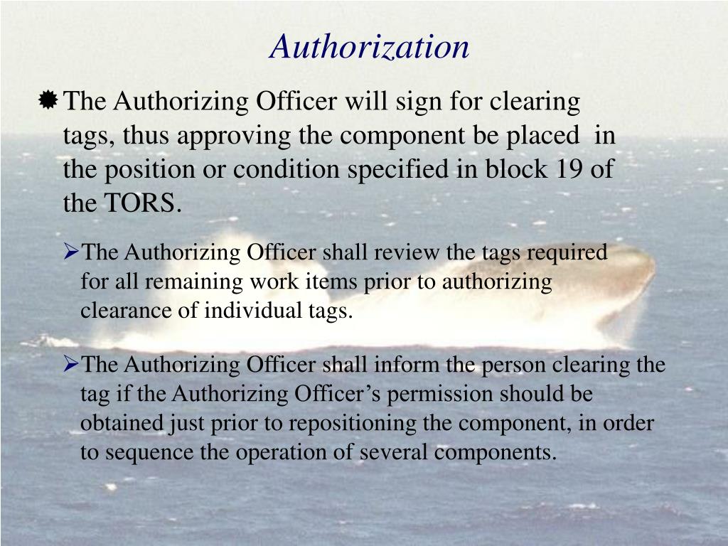Authorization • The Authorizing Officer will sign for clearing tags, thus approving the component be placed in the position or condition specified in block 19 of the TORS. • The Authorizing Officer shall review the tags required for all remaining work items prior to authorizing clearance of individual tags. • The Authorizing Officer shall inform the person clearing the tag if the Authorizing Officer’s permission should be obtained just prior to repositioning the component, in order to sequence the operation of several components.