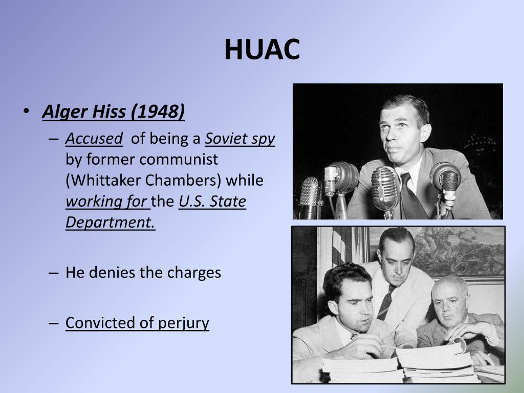 HUAC • Alger Hiss (1948) • Accused of being a Soviet spy by former communist (Whittaker Chambers) while working for the U.S. State Department. • He denies the charges • Convicted of perjury