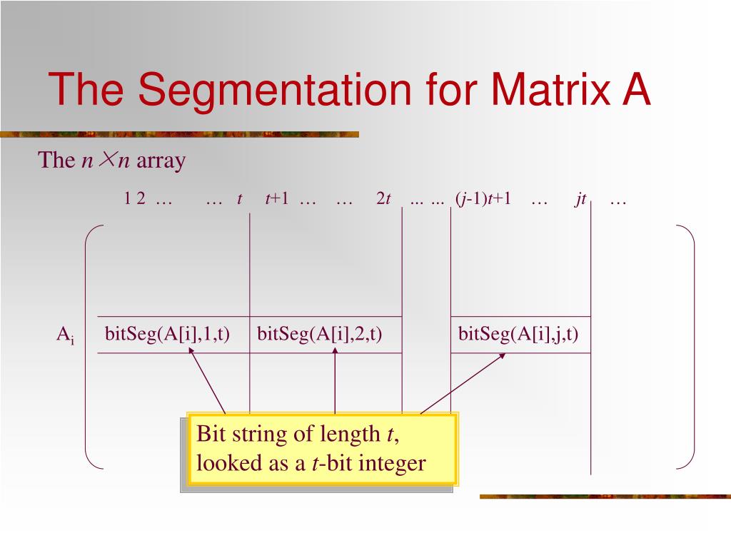 The Segmentation for Matrix A The n×n array 1 2 … … tt+1 … … 2t … … (j-1)t+1 … jt … Ai bitSeg(A[i],1,t) bitSeg(A[i],2,t) bitSeg(A[i],j,t) Bit string of length t, looked as a t-bit integer