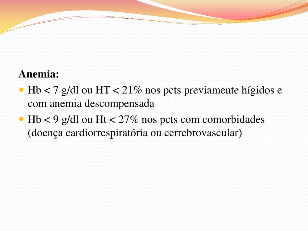 Anemia: • Hb < 7 g/dl ou HT < 21% nos pcts previamente hígidos e com anemia descompensada • Hb < 9 g/dl ou Ht < 27% nos pcts com comorbidades (doença cardiorrespiratória ou cerrebrovascular)