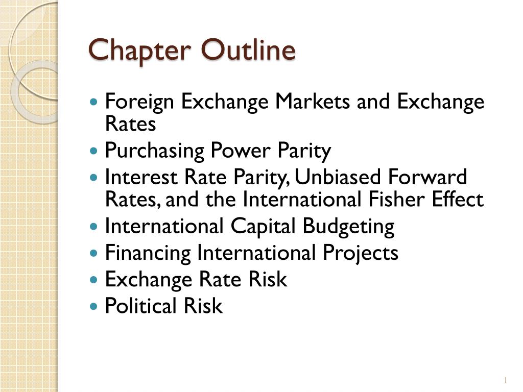 Chapter Outline • Foreign Exchange Markets and Exchange Rates • Purchasing Power Parity • Interest Rate Parity, Unbiased Forward Rates, and the International Fisher Effect • International Capital Budgeting • Financing International Projects • Exchange Rate Risk • Political Risk