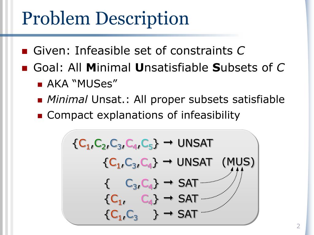 {C1,C2,C3,C4,C5} UNSAT {C1,C3,C4} UNSAT (MUS) { C3,C4} SAT {C1, C4} SAT {C1,C3 } SAT Problem Description • Given: Infeasible set of constraints C • Goal: All Minimal Unsatisfiable Subsets of C • AKA “MUSes” • Minimal Unsat.: All proper subsets satisfiable • Compact explanations of infeasibility