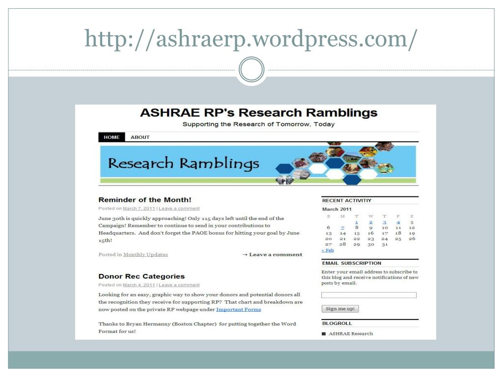 Take Advantage Of All Available Resources! • RP Blog • http://ashraerp.wordpress.com • Private RP Webpage • www.ashraerp.com • Main ASHRAE Webpage • www.ashrae.org/rp