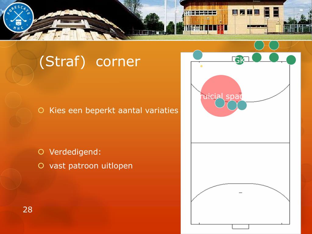 (Straf) corner GK • Kies een beperkt aantal variaties • Verdedigend: • vast patroon uitlopen Cruicial space