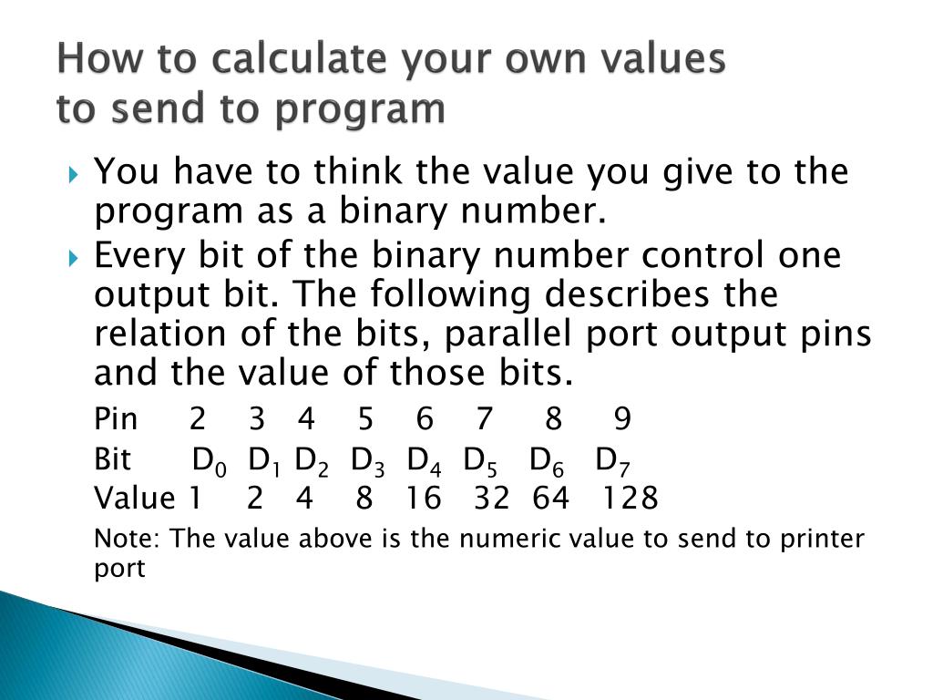How to calculate your own values to send to program • You have to think the value you give to the program as a binary number. • Every bit of the binary number control one output bit. The following describes the relation of the bits, parallel port output pins and the value of those bits. Pin 2 3 4 5 6 7 8 9 Bit D0 D1 D2 D3 D4 D5 D6 D7 Value 1 2 4 8 16 32 64 128 Note: The value above is the numeric value to send to printer port