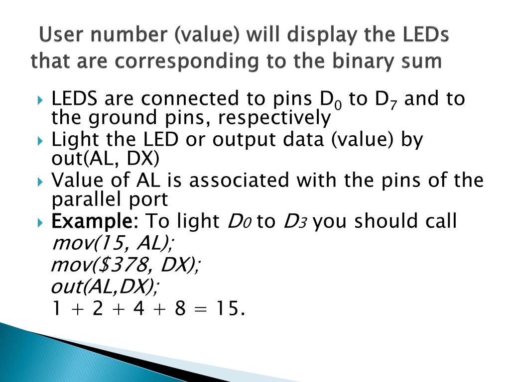 User number (value) will display the LEDs that are corresponding to the binary sum • LEDS are connected to pins D0 to D7 and to the ground pins, respectively • Light the LED or output data (value) by out(AL, DX) • Value of AL is associated with the pins of the parallel port • Example: To light D0 to D3you should call mov(15, AL); mov($378, DX); out(AL,DX); 1 + 2 + 4 + 8 = 15.