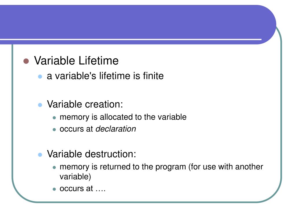 Computer Science 1620. Lifetime & Scope. Variable Lifetime a variable's lifetime is finite Variable creation: memory is allocated to the variable occurs at declaration Variable destruction: memory is returned to the program (for use with another variable) occurs at ….