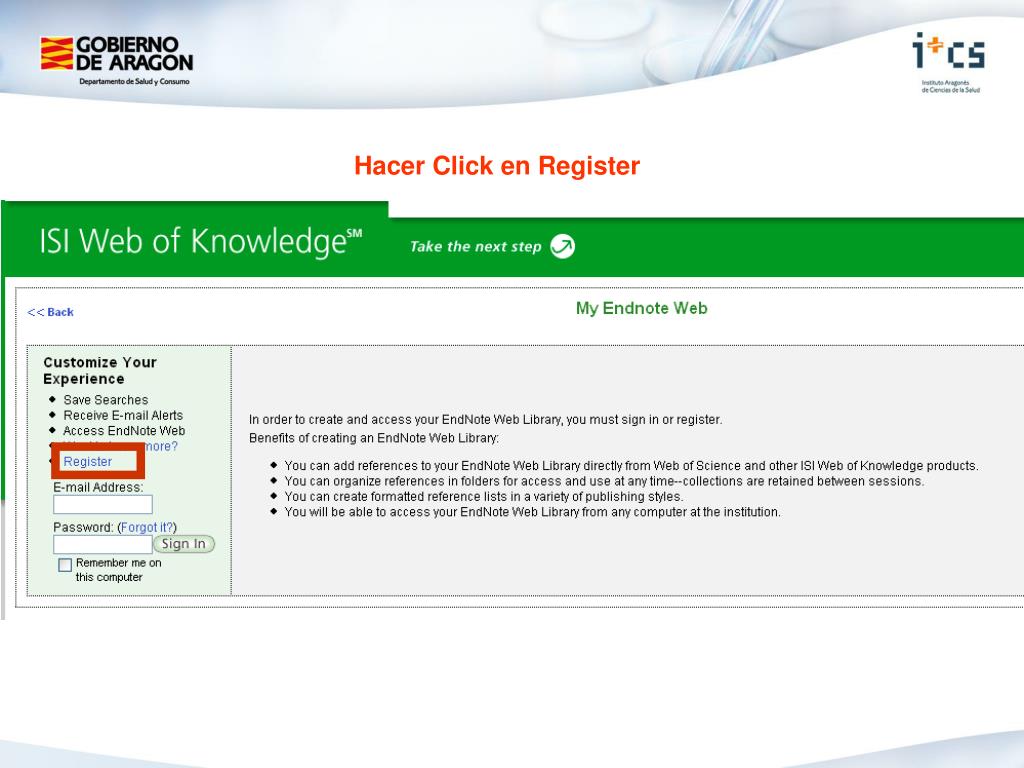 Registro y acceso • Biblioteca Virtual del I+CS • ISI Web of Knowledge • EndNote Web