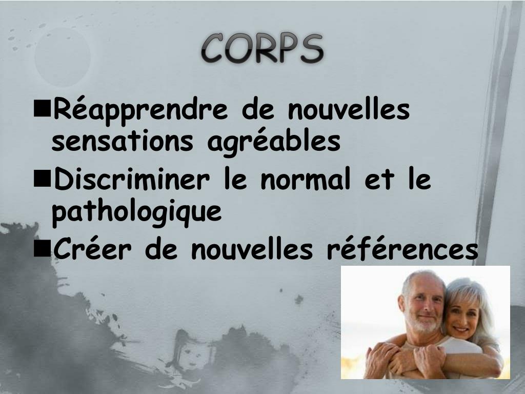 CORPS • Réapprendre de nouvelles sensations agréables • Discriminer le normal et le pathologique • Créer de nouvelles références