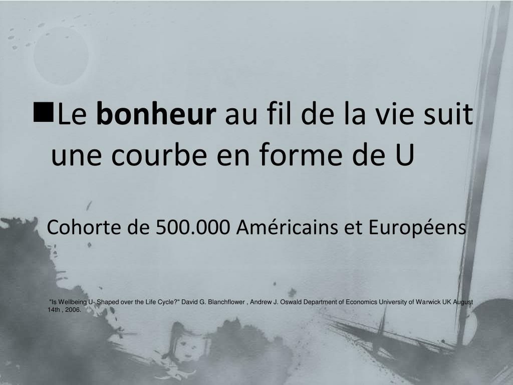 Le bonheur au fil de la vie suit une courbe en forme de U Cohorte de 500.000 Américains et Européens "Is Wellbeing U- Shaped over the Life Cycle?" David G. Blanchflower , Andrew J. Oswald Department of Economics University of Warwick UK August 14th , 2006.