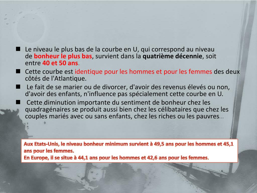 Le niveau le plus bas de la courbe en U, qui correspond au niveau de bonheur le plus bas, survient dans la quatrième décennie, soit entre 40 et 50 ans. • Cette courbe est identique pour les hommes et pour les femmes des deux côtés de l'Atlantique. • Le fait de se marier ou de divorcer, d'avoir des revenus élevés ou non, d'avoir des enfants, n'influence pas spécialement cette courbe en U. • Cette diminution importante du sentiment de bonheur chez les quadragénaires se produit aussi bien chez les célibataires que chez les couples mariés avec ou sans enfants, chez les riches ou les pauvres Aux Etats-Unis, le niveau bonheur minimum survient à 49,5 ans pour les hommes et 45,1 ans pour les femmes. En Europe, il se situe à 44,1 ans pour les hommes et 42,6 ans pour les femmes.
