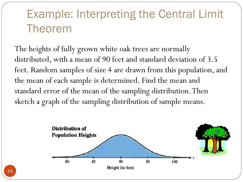 Example: Interpreting the Central Limit Theorem The heights of fully grown white oak trees are normally distributed, with a mean of 90 feet and standard deviation of 3.5 feet. Random samples of size 4 are drawn from this population, and the mean of each sample is determined. Find the mean and standard error of the mean of the sampling distribution. Then sketch a graph of the sampling distribution of sample means.