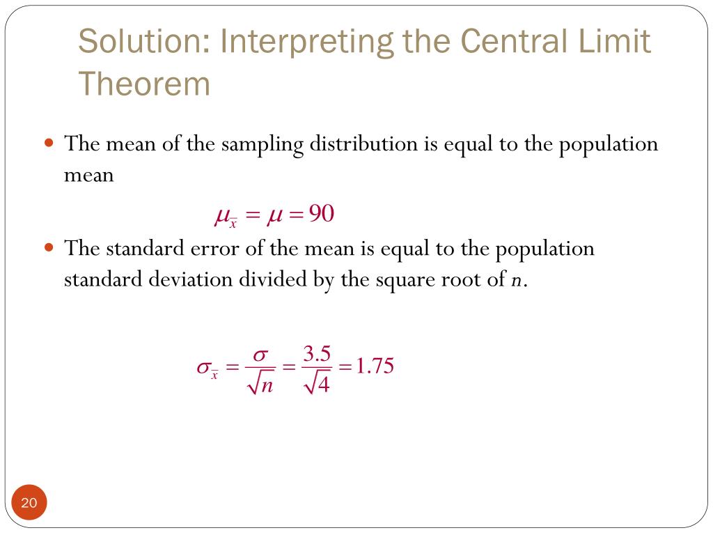 Solution: Interpreting the Central Limit Theorem • The mean of the sampling distribution is equal to the population mean • The standard error of the mean is equal to the population standard deviation divided by the square root of n.