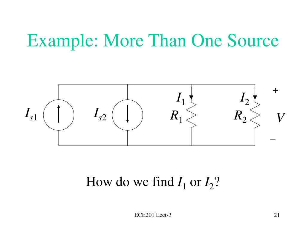 Example: More Than One Source How do we find I1 or I2? + I1 I2 Is1 Is2 R1 R2 V – ECE201 Lect-3