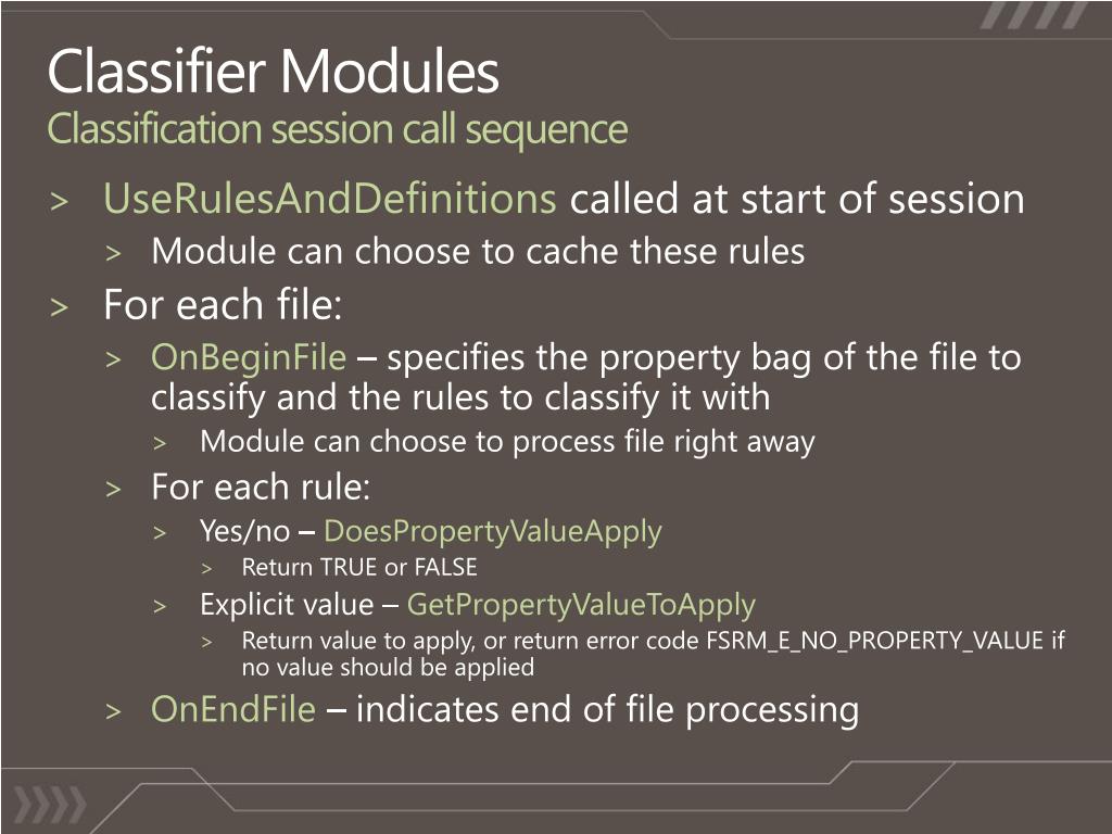 Classifier ModulesClassification session call sequence • UseRulesAndDefinitions called at start of session • Module can choose to cache these rules • For each file: • OnBeginFile – specifies the property bag of the file to classify and the rules to classify it with • Module can choose to process file right away • For each rule: • Yes/no – DoesPropertyValueApply • Return TRUE or FALSE • Explicit value – GetPropertyValueToApply • Return value to apply, or return error code FSRM_E_NO_PROPERTY_VALUE if no value should be applied • OnEndFile – indicates end of file processing