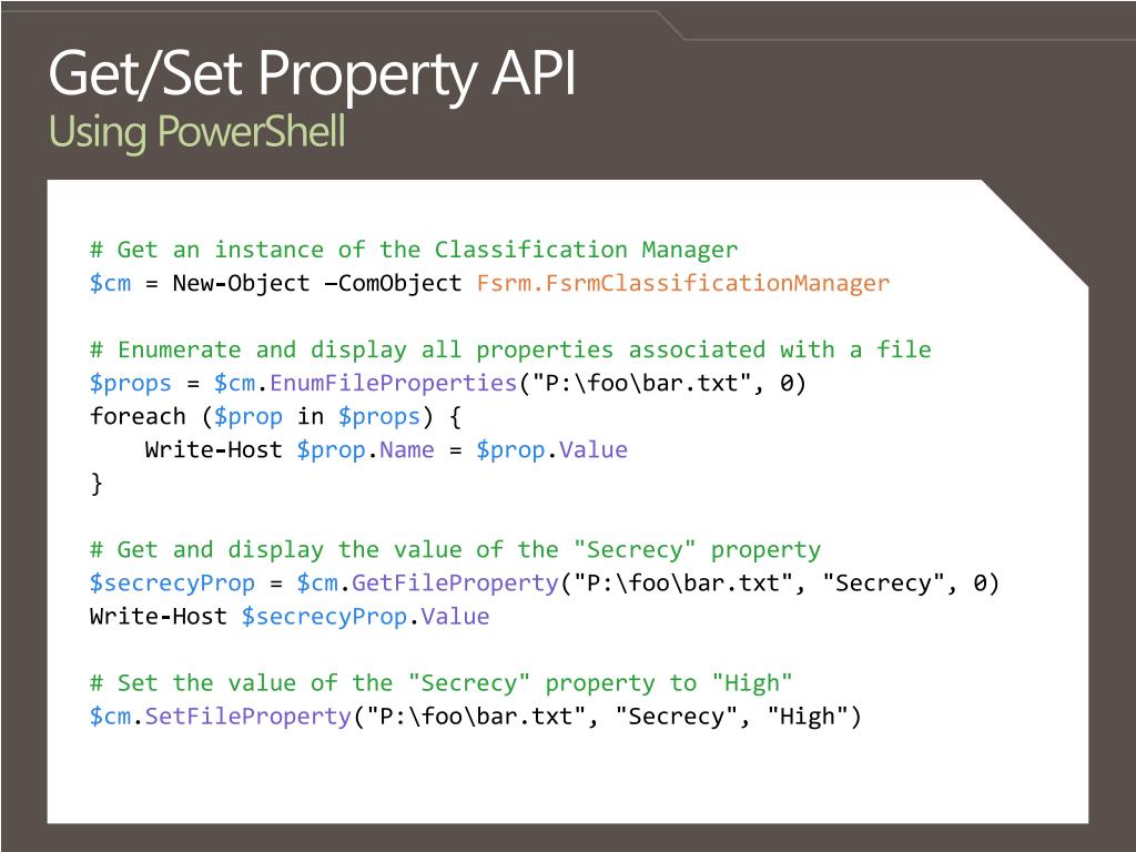 Get/Set Property APIUsing PowerShell • # Get an instance of the Classification Manager • $cm = New-Object –ComObjectFsrm.FsrmClassificationManager • # Enumerate and display all properties associated with a file • $props = $cm.EnumFileProperties("P:\foo\bar.txt", 0) • foreach ($prop in $props) { • Write-Host $prop.Name = $prop.Value • } • # Get and display the value of the "Secrecy" property • $secrecyProp = $cm.GetFileProperty("P:\foo\bar.txt", "Secrecy", 0) • Write-Host $secrecyProp.Value • # Set the value of the "Secrecy" property to "High" • $cm.SetFileProperty("P:\foo\bar.txt", "Secrecy", "High")