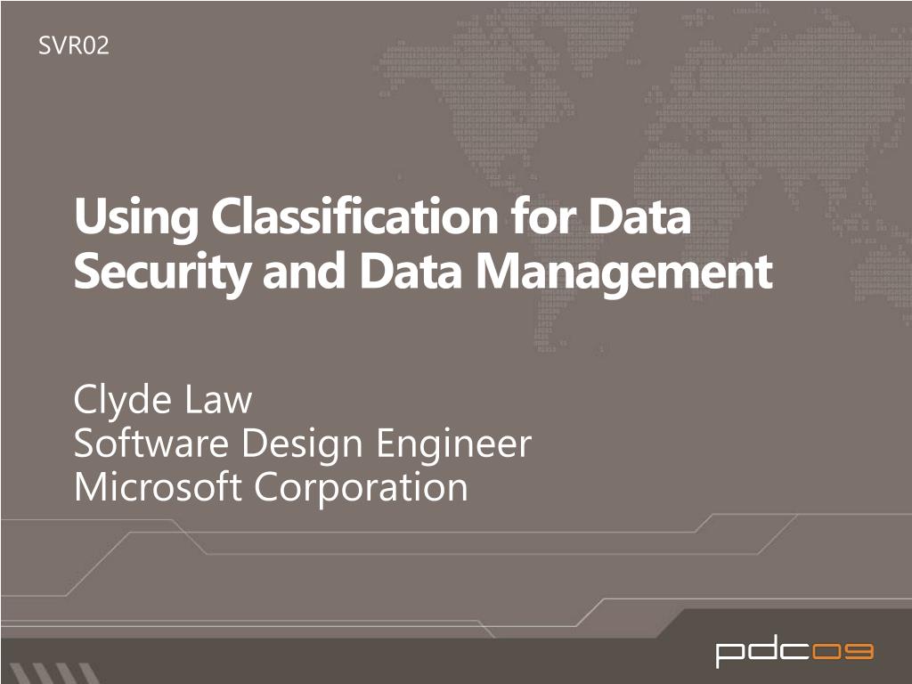 SVR02 Using Classification for Data Security and Data Management Clyde Law Software Design Engineer Microsoft Corporation