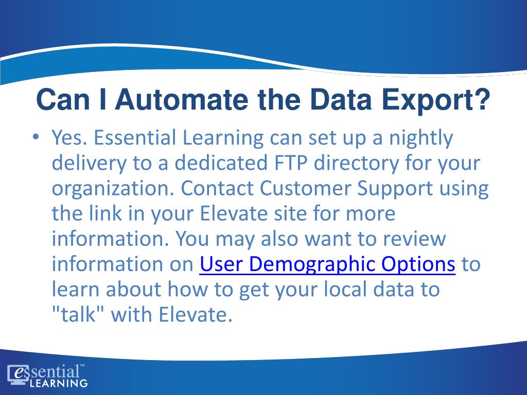 Can I Automate the Data Export? • Yes. Essential Learning can set up a nightly delivery to a dedicated FTP directory for your organization. Contact Customer Support using the link in your Elevate site for more information. You may also want to review information on User Demographic Options to learn about how to get your local data to "talk" with Elevate.