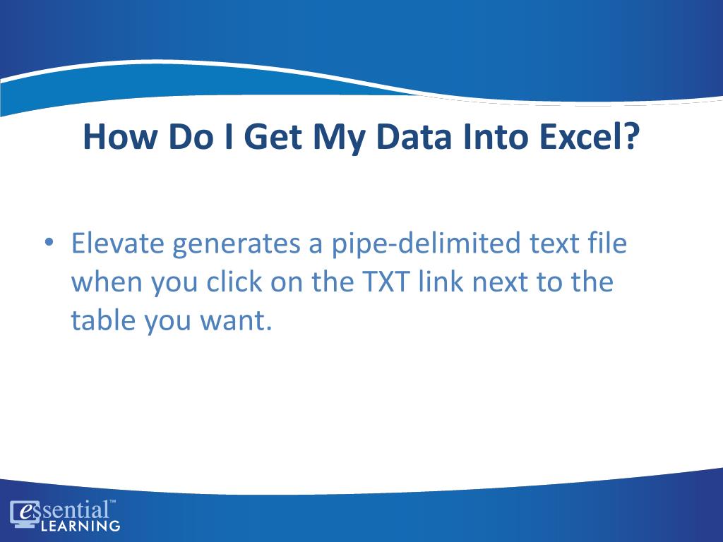 How Do I Get My Data Into Excel? • Elevate generates a pipe-delimited text file when you click on the TXT link next to the table you want.