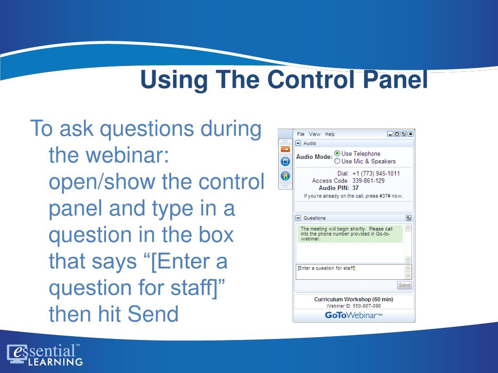 Using Using The Control Panel Control Panel To ask questions during the webinar: open/show the control panel and type in a question in the box that says “[Enter a question for staff]” then hit Send