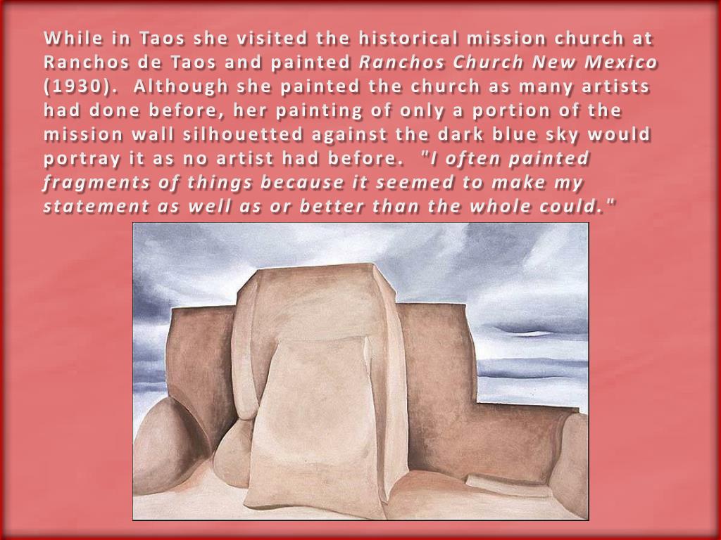 While in Taos she visited the historical mission church at Ranchos de Taos and painted Ranchos Church New Mexico (1930). Although she painted the church as many artists had done before, her painting of only a portion of the mission wall silhouetted against the dark blue sky would portray it as no artist had before. "I often painted fragments of things because it seemed to make my statement as well as or better than the whole could."