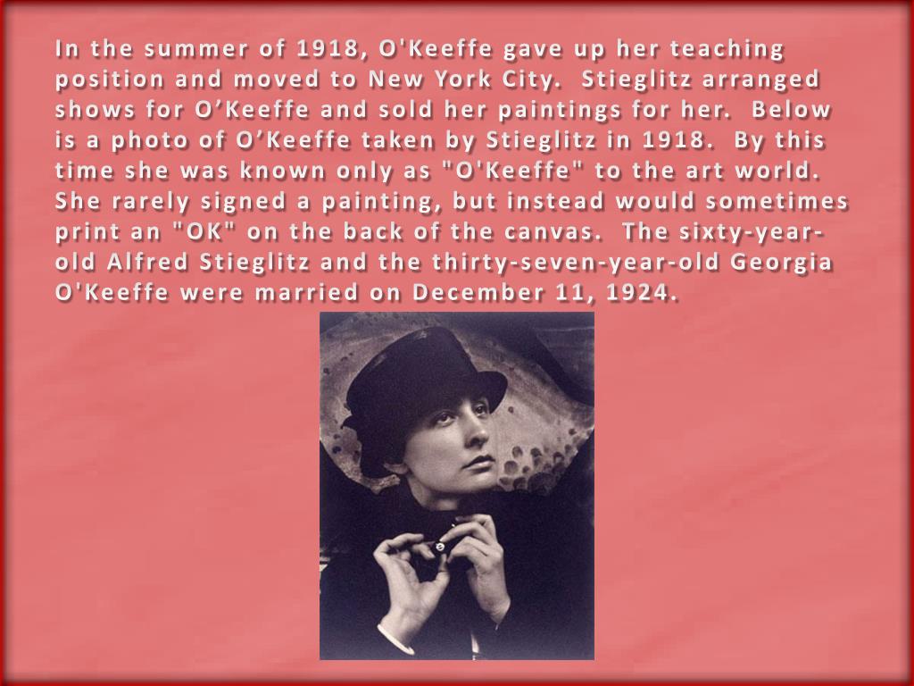 In the summer of 1918, O'Keeffe gave up her teaching position and moved to New York City. Stieglitz arranged shows for O’Keeffe and sold her paintings for her. Below is a photo of O’Keeffe taken by Stieglitz in 1918. By this time she was known only as "O'Keeffe" to the art world. She rarely signed a painting, but instead would sometimes print an "OK" on the back of the canvas. The sixty-year-old Alfred Stieglitz and the thirty-seven-year-old Georgia O'Keeffe were married on December 11, 1924.