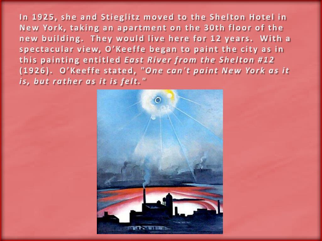 In 1925, she and Stieglitz moved to the Shelton Hotel in New York, taking an apartment on the 30th floor of the new building. They would live here for 12 years. With a spectacular view, O’Keeffe began to paint the city as in this painting entitled East River from the Shelton #12 (1926). O’Keeffe stated, "One can't paint New York as it is, but rather as it is felt."