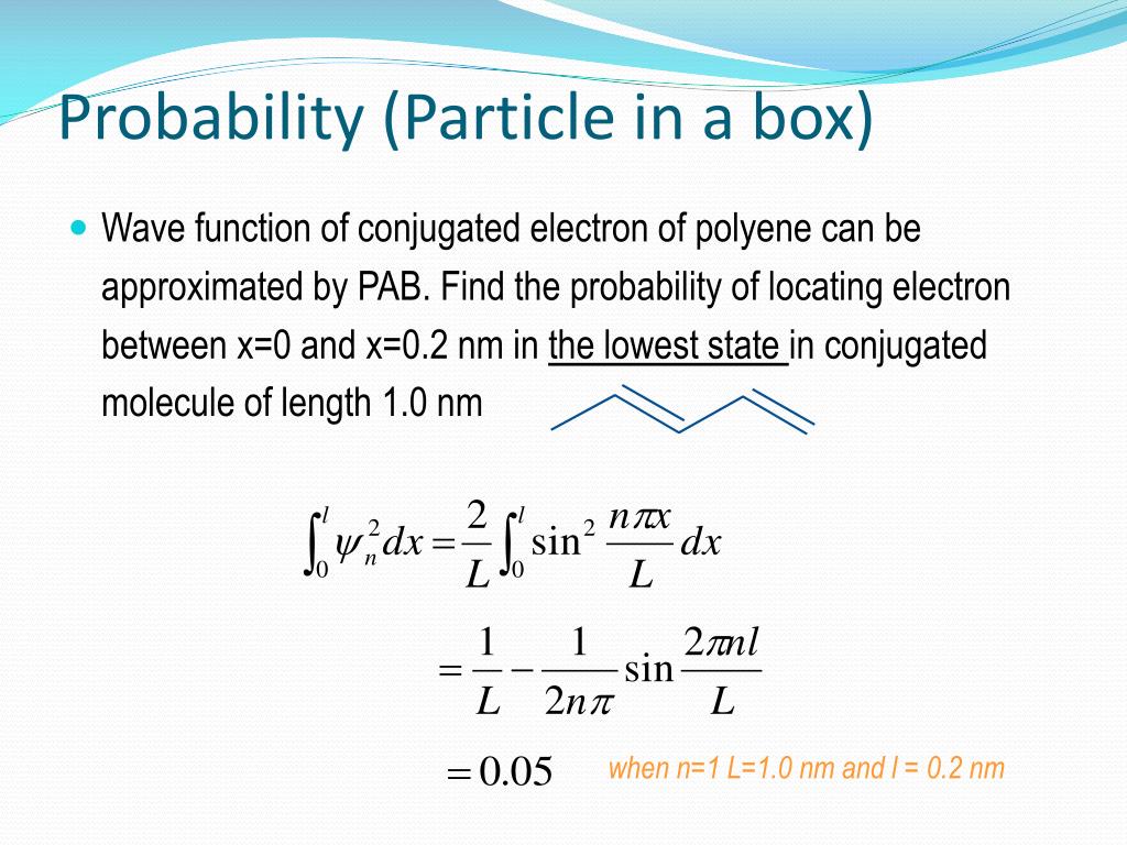 Probability (Particle in a box) • Wave function of conjugated electron of polyene can be approximated by PAB. Find the probability of locating electron between x=0 and x=0.2 nm in the lowest state in conjugated molecule of length 1.0 nm when n=1 L=1.0 nm and l = 0.2 nm
