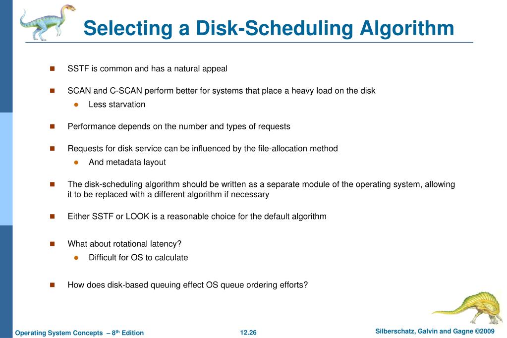 Selecting a Disk-Scheduling Algorithm • SSTF is common and has a natural appeal • SCAN and C-SCAN perform better for systems that place a heavy load on the disk • Less starvation • Performance depends on the number and types of requests • Requests for disk service can be influenced by the file-allocation method • And metadata layout • The disk-scheduling algorithm should be written as a separate module of the operating system, allowing it to be replaced with a different algorithm if necessary • Either SSTF or LOOK is a reasonable choice for the default algorithm • What about rotational latency? • Difficult for OS to calculate • How does disk-based queuing effect OS queue ordering efforts?