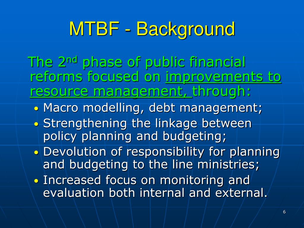 MTBF - Background The 2nd phase of public financial reforms focused on improvements to resource management, through: • Macro modelling, debt management; • Strengthening the linkage between policy planning and budgeting; • Devolution of responsibility for planning and budgeting to the line ministries; • Increased focus on monitoring and evaluation both internal and external.