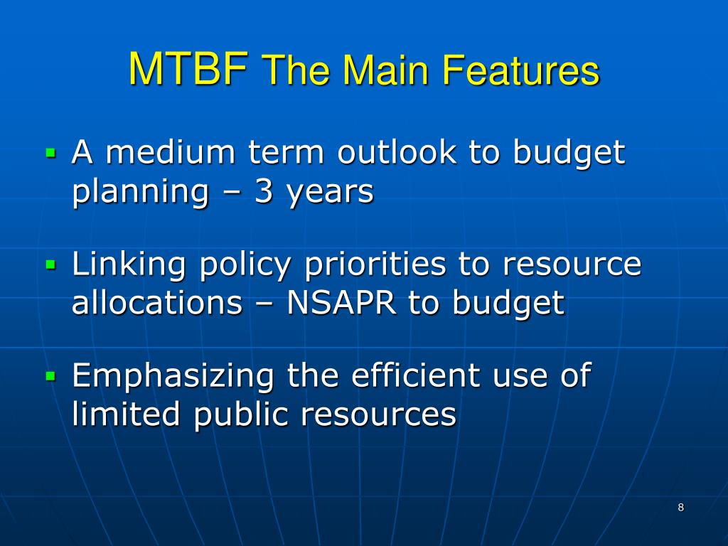 MTBF The Main Features • A medium term outlook to budget planning – 3 years • Linking policy priorities to resource allocations – NSAPR to budget • Emphasizing the efficient use of limited public resources