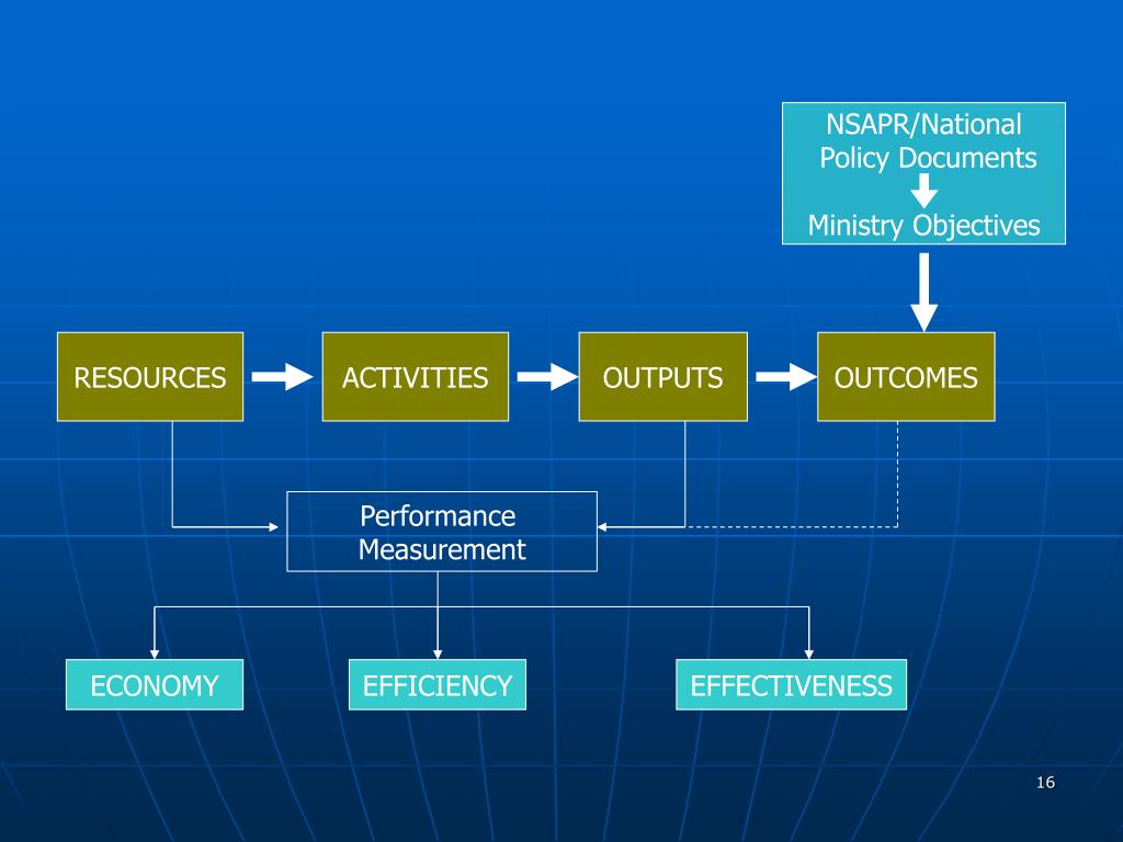 NSAPR/National Policy Documents Ministry Objectives RESOURCES ACTIVITIES OUTPUTS OUTCOMES Performance Measurement ECONOMY EFFICIENCY EFFECTIVENESS