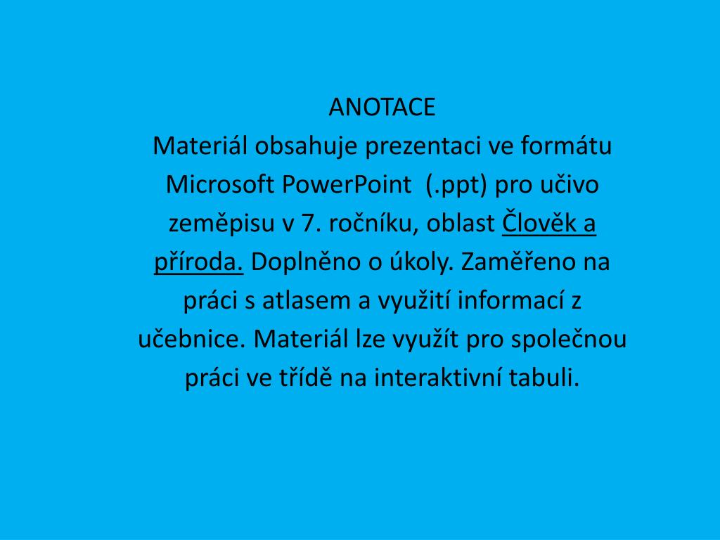 ANOTACE Materiál obsahuje prezentaci ve formátu Microsoft PowerPoint (.ppt) pro učivo zeměpisu v 7. ročníku, oblast Člověk a příroda. Doplněno o úkoly. Zaměřeno na práci s atlasem a využití informací z učebnice. Materiál lze využít pro společnou práci ve třídě na interaktivní tabuli.