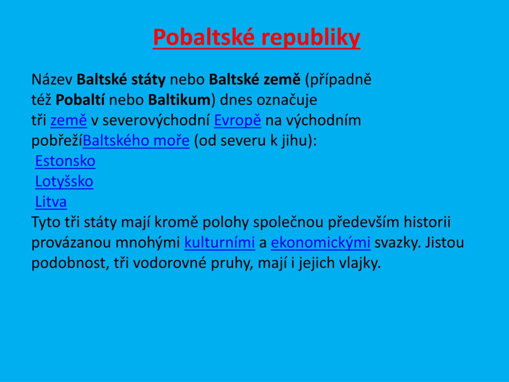 Pobaltské republiky Název Baltské státy nebo Baltské země (případně též Pobaltí nebo Baltikum) dnes označuje tři země v severovýchodní Evropě na východním pobřežíBaltského moře (od severu k jihu): Estonsko Lotyšsko Litva Tyto tři státy mají kromě polohy společnou především historii provázanou mnohými kulturními a ekonomickými svazky. Jistou podobnost, tři vodorovné pruhy, mají i jejich vlajky.