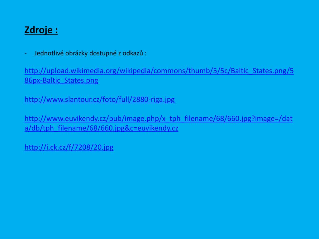 Zdroje : • Jednotlivé obrázky dostupné z odkazů : • http://upload.wikimedia.org/wikipedia/commons/thumb/5/5c/Baltic_States.png/586px-Baltic_States.png • http://www.slantour.cz/foto/full/2880-riga.jpg • http://www.euvikendy.cz/pub/image.php/x_tph_filename/68/660.jpg?image=/data/db/tph_filename/68/660.jpg&c=euvikendy.cz • http://i.ck.cz/f/7208/20.jpg