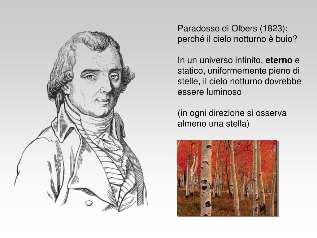 Paradosso di Olbers (1823): perché il cielo notturno è buio? In un universo infinito, eterno e statico, uniformemente pieno di stelle, il cielo notturno dovrebbe essere luminoso (in ogni direzione si osserva almeno una stella)