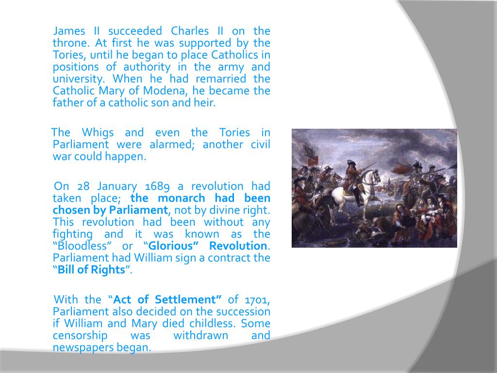 James II succeeded Charles II on the throne. At first he was supported by the Tories, until he began to place Catholics in positions of authority in the army and university. When he had remarried the Catholic Mary of Modena, he became the father of a catholic son and heir. The Whigs and even the Tories in Parliament were alarmed; another civil war could happen. On 28 January 1689 a revolution had taken place; the monarch had been chosen by Parliament, not by divine right. This revolution had been without any fighting and it was known as the “Bloodless” or “Glorious” Revolution. Parliament had William sign a contract the “Bill of Rights”. With the “Act of Settlement” of 1701, Parliament also decided on the succession if William and Mary died childless. Some censorship was withdrawn and newspapers began.