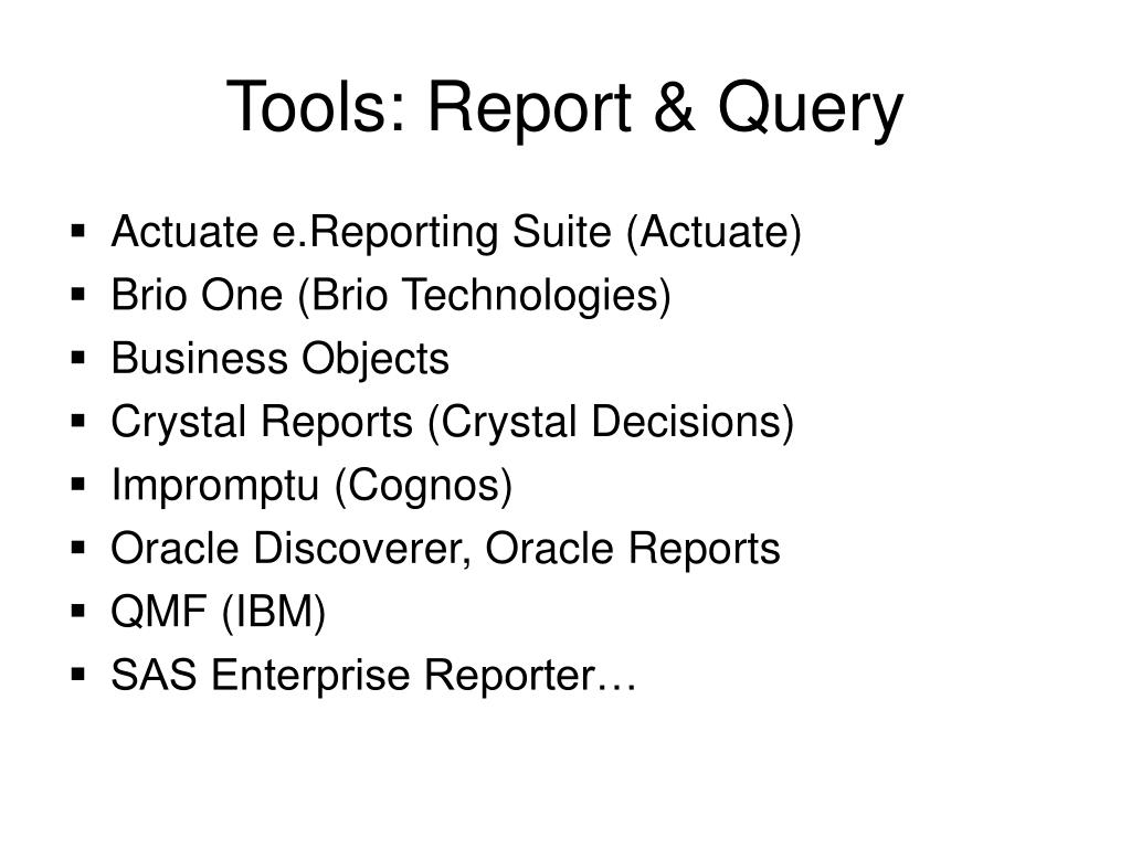 Tools: Report & Query • Actuate e.Reporting Suite (Actuate) • Brio One (Brio Technologies) • Business Objects • Crystal Reports (Crystal Decisions) • Impromptu (Cognos) • Oracle Discoverer, Oracle Reports • QMF (IBM) • SAS Enterprise Reporter…