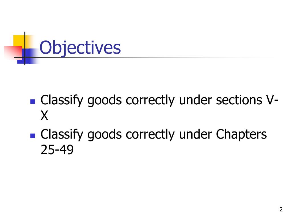 Objectives • Classify goods correctly under sections V-X • Classify goods correctly under Chapters 25-49