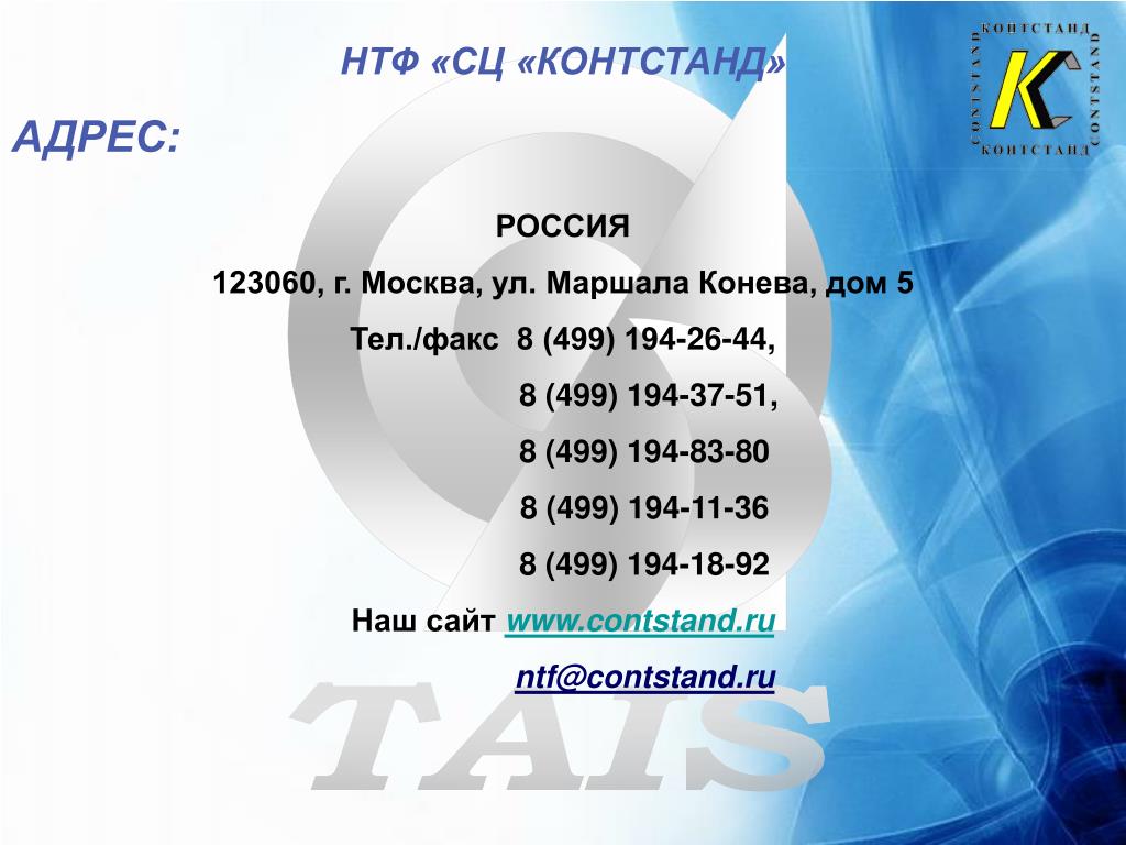 TAIS НТФ «СЦ «КОНТСТАНД» АДРЕС: РОССИЯ 123060, г. Москва, ул. Маршала Конева, дом 5 Тел./факс 8 (499) 194-26-44, 8 (499)194-37-51, 8 (499)194-83-80 8 (499) 194-11-36 8 (499) 194-18-92 Наш сайт www.contstand.ru ntf@contstand.ru
